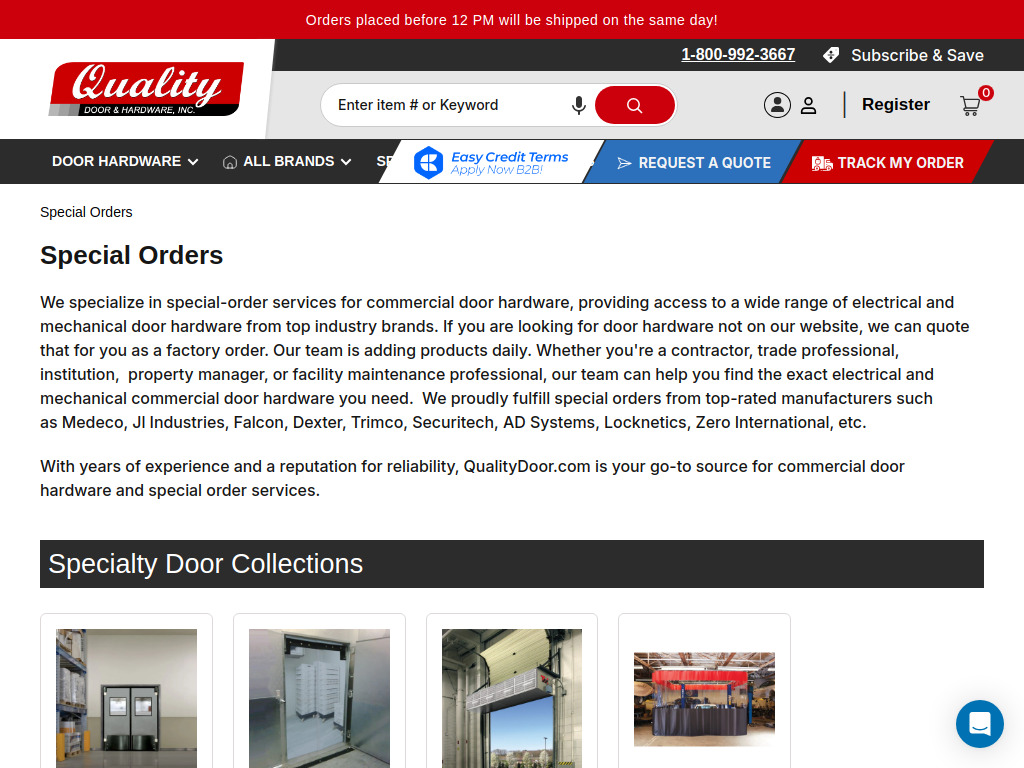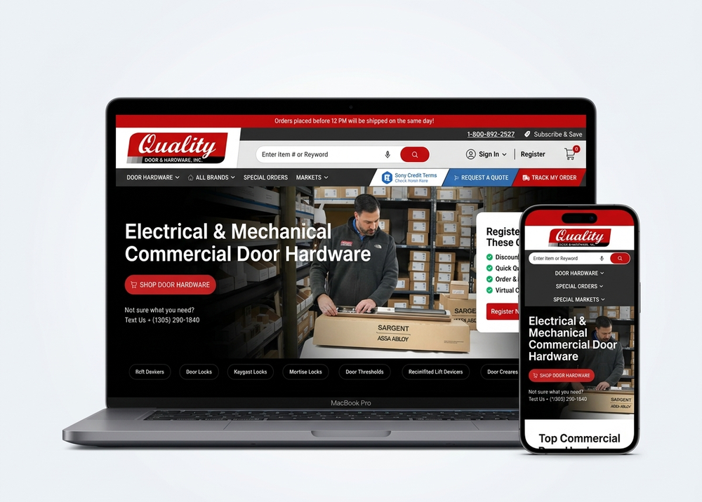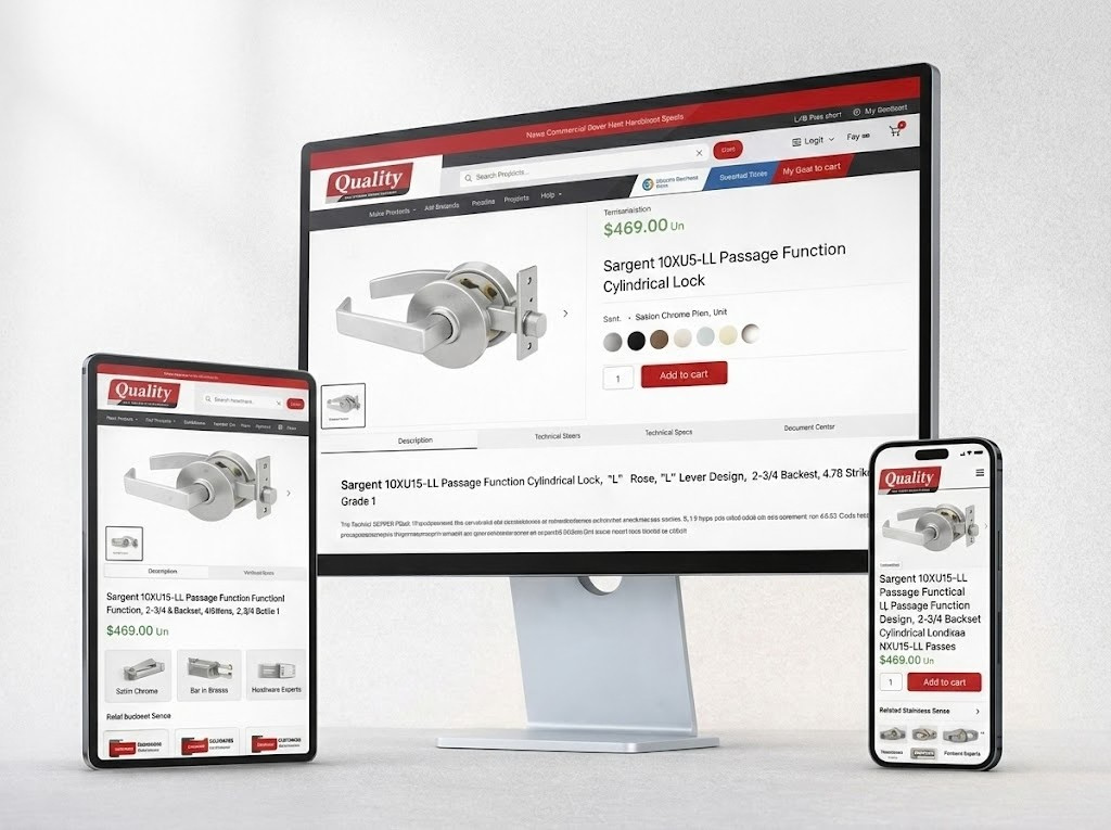 A US-based commercial door hardware supplier serving contractors, government agencies, and healthcare facilities. The project included custom navigation for hundreds of product categories, B2B registration flows, and a quote request system tailored for trade professionals.